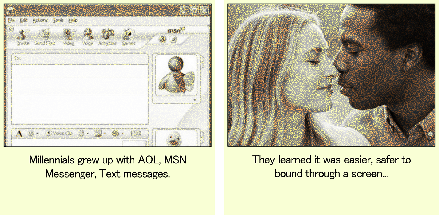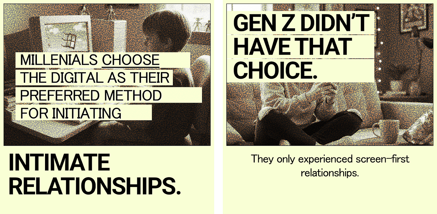 Finally, COVID-19 happened: lockdowns confirmed that physical presence isn’t necessary for meaningful connection. For Gen Z, pandemic restrictions hit during critical teenage socialization years, cementing digital-first relationships as not just a preference but the unique option.