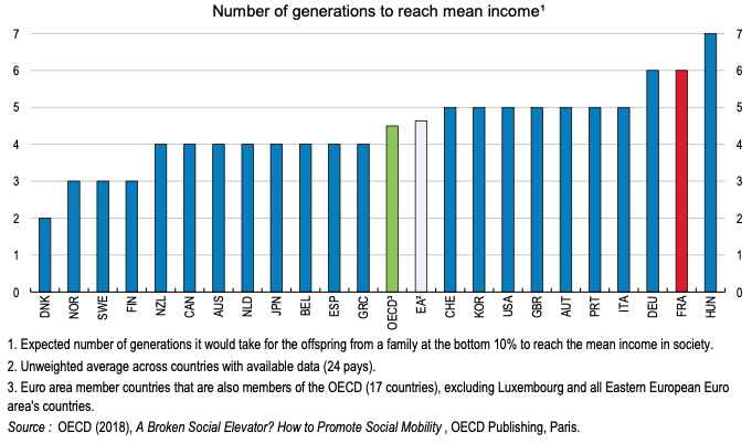 “It takes more than six generations in France for a person at the bottom end of income distribution to reach the mean.”