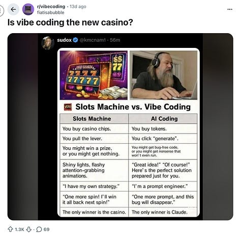 Social media is like cigarettes for your eyes. I keep my Instagram to ten minutes a day. During one of those ten minutes, I watched a content creator draw a comparison between vibe coding and slot machines. The rolling code, the waiting, the almost-working output. The loop that never quite closes.